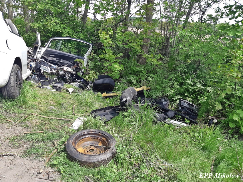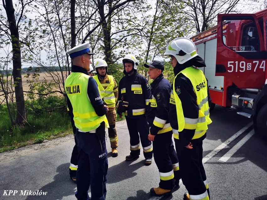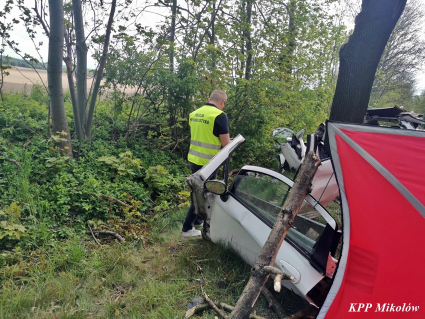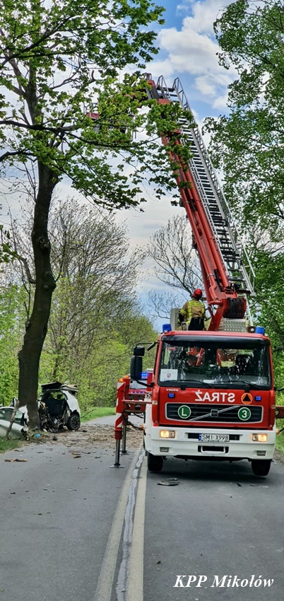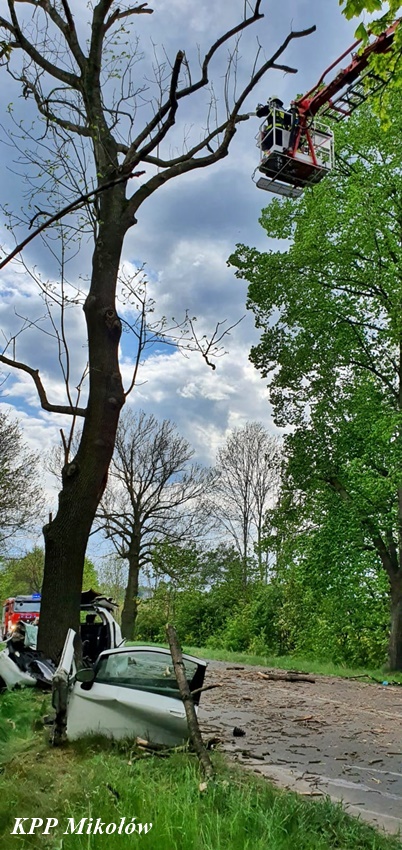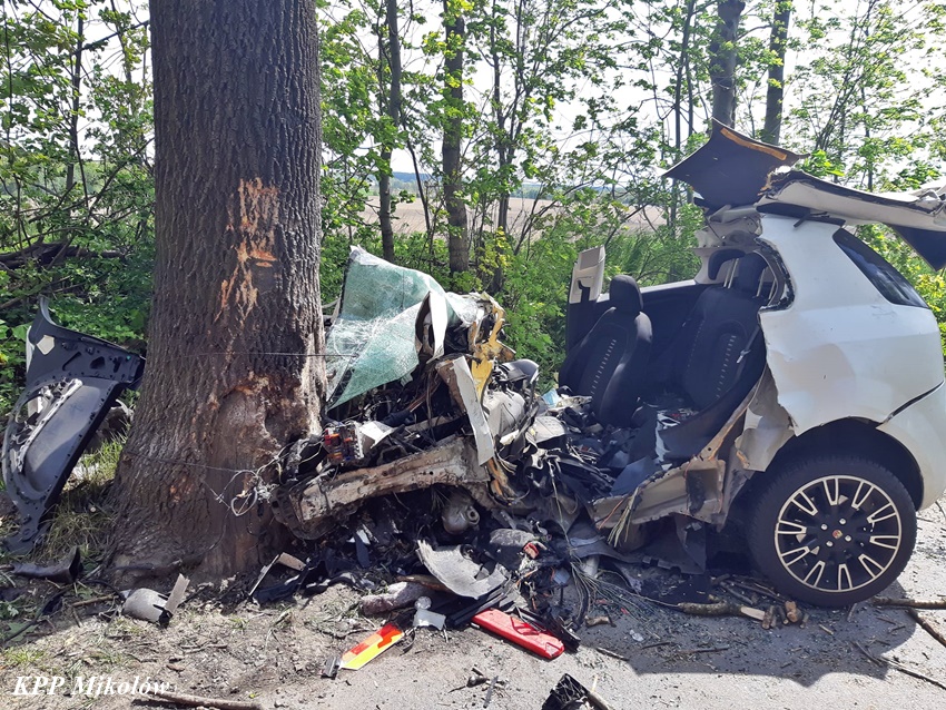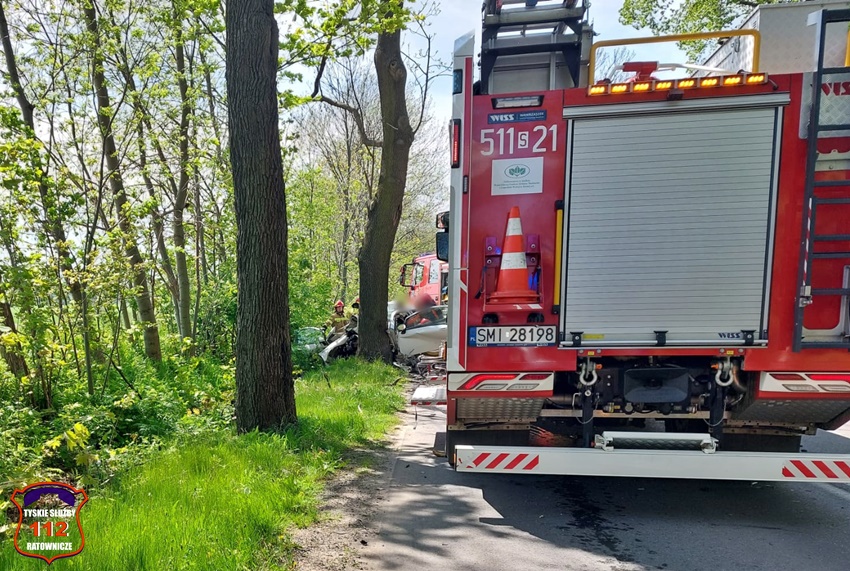 12 maja przed godziną 11 na ul. Pszczyńskiej (DW 928 ) w Wyrach doszło do tragicznego w skutkach wypadku drogowego. Z niewyjaśnionych przyczyn kierujący samochodem marki Fiat Punto Abarth uderzył w przydrożne drzewo. Świadkowie zdarzeni powiadomili o zdarzeniu operatora nr alarmowego 112. Poprzez formatkę zaalarmowane na miejsce zostały: ZRM, zastępy strażaków JRG Mikołów, OSP Gostyń oraz Policja. Na czas działań służb ratunkowych ruch został całkowicie wstrzymany. Niestety po przybyciu służb ratunkowych na miejsce okazało się, że nie ma szans na ratunek dla kierowcy osobówki. Obrażenia okazały się śmiertelne w skutkach. Strażacy przy użyciu narzędzi hydraulicznych wydobyli zwłoki mężczyzny z pojazdu. Na miejsce wezwany został policyjny technik kryminalistyki, grupa dochodzeniowo – śledcza oraz prokurator. Ze wstępnych ustaleń pracujących na miejscu Policjantów wynika, że nie było żadnych śladów hamowania, a w wyniku zdarzenia zginał 34 – letni mieszkaniec Wyr. Po wykonaniu czynności okazało się, że jest konieczne usunięcie części nadłamanych gałęzi korony drzewa w które uderzył samochód. Utrudnienia w ruchu w miejscu zdarzenia trwały ponad trzy godziny. Mikołowscy Policjanci pod nadzorem prokuratury prowadzą dochodzenie w tej sprawie.