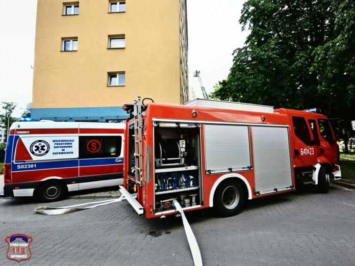 11 czerwca około godziny 12:20 dyżurny SK KM PSP Tychy otrzymał zgłoszenie o pożarze mieszkania na siódmym piętrze w budynku wielorodzinnym przy ul. Dębowej 8c. Na miejsce zgłoszenia natychmiast zadysponowany został pluton gaśniczy JRG Tychy oraz ZRM i patrol Policji. Ze zgłoszenia wynikało, że w płonącym mieszkaniu mają znajdować się dwie osoby. Po przybyciu na miejsce i po przystąpieniu do rozpoznania i działań ratowniczo – gaśniczych doszło do tragedii. Mężczyzna (35 lat) opuścił mieszkanie przez okno i po rynnie udało mu się dostać do mieszkania poniżej gdzie trafił pod opiekę strażaków i przybyłych na miejsce ratowników medycznych. Niestety lokatorka (ok. 60 lat) nie dała rady się utrzymać i spadła ponosząc śmierć na miejscu. Strażacy podali dwa prądy wody na palące się wyposażenie mieszkania. Jeden z kosza drabiny mechanicznej, a drugi po rozwinięciu linii gaśniczej po klatce schodowej. Mężczyzna z licznymi oparzeniami kończyn został przetransportowany do Centrum leczenia Oparzeń w Siemianowicach Śląskich. Na miejsce zdarzenia przybyły grupy operacyjne KM PSP Tychy oraz KW PSP Katowice. Po zakończeniu działań ratowniczo – gaśniczych czynności na miejscu podjęła grupa dochodzeniowo – śledcza wraz z technikiem kryminalistyki KMP Tychy pod nadzorem prokuratury. Trwa wyjaśnianie przyczyn i okoliczności powstania tego tragicznego w skutkach pożaru.