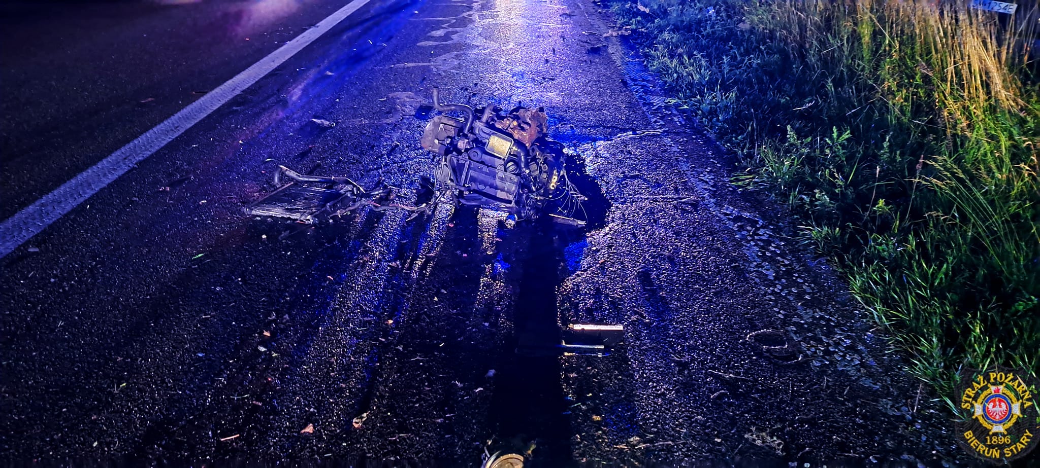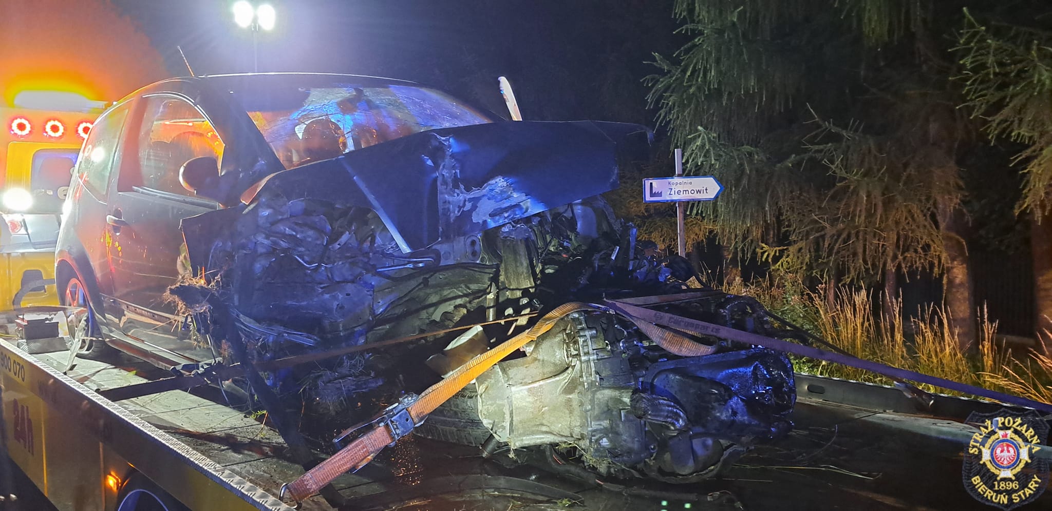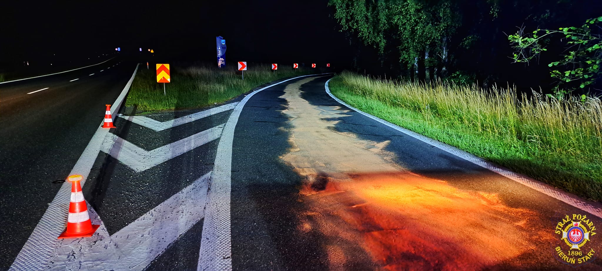 8 lipca około godziny 22 dyżurny SK KM PSP Tychy otrzymał zgłoszenie o plamie substancji ropopochodnej z zjeździe z ul. Turyńskiej na ul. Lędzińską w Bieruniu. Na miejsce zdarzenia zadysponowane zostały zastępy strażaków OSP Bieruń Stary i JRG Tychy oraz patrol Policji. Po dotarciu na miejsce okazało się, że plama ciągnie się na długości około 700m, a dodatkowo na plamie oleju panowanie nad swoim pojazdem utracił kierujący Citroenem i uderzył w przydrożne drzewo i ogrodzenie posesji. W wyniku tego uderzenia z małej osobówki wypadł silnik. Na miejsce wezwany został dodatkowo ZRM, który przetransportował kierowcę do szpitala. Ze wstępnych ustaleń pracujących na miejscu Policjantów wynika, że doszło do nieszczęśliwego zdarzenia. Jadący kilka chwil przed citroenem samochód osobowy uszkodził miskę olejową, z której doszło do wycieku. Ta sytuacja została zgłoszona operatorowi numeru alarmowego 112. Kilku kierowców wpadło w poślizg ale bez konsekwencji, niestety kierowca Citroena nie miał tyle szczęścia. Działania na miejscu trwały blisko dwie godziny. Policjanci KPP Bieruń prowadzą dalsze postępowanie w tej sprawie.