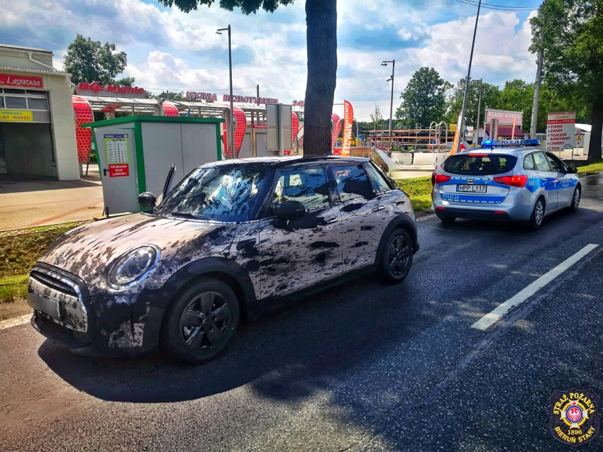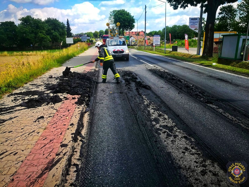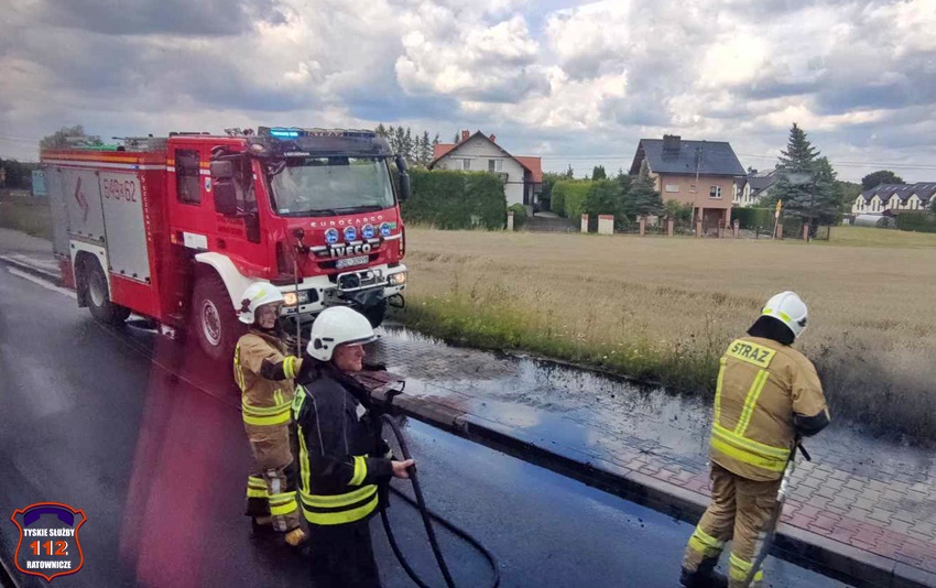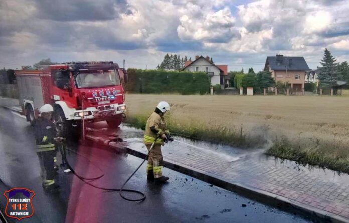 27 lipca około godziny 12:30 dyżurny SK KM PSP Tychy otrzymał zgłoszenie o zanieczyszczeniu pasa drogowego na ul. Warszawskiej w Bieruniu. Ze zgłoszenia wynikało, że z samochodu ciężarowego wysypał się muł. Na miejsce zdarzenia zadysponowany został patrol Policji oraz zastęp strażaków OSP Bieruń Stary. Po przybyciu na miejsce zgłoszenie potwierdziło się, a dodatkowo w wysypany materiał wjechał kierowca osobowego Mini. Strażacy przy użyciu podręcznego sprzętu (łopaty) oraz podając jeden prąd wody w natarciu usunęli maź z drogi. Na czas trwania działań w miejscu zdarzenia obowiązywał ruch wahadłowy.
