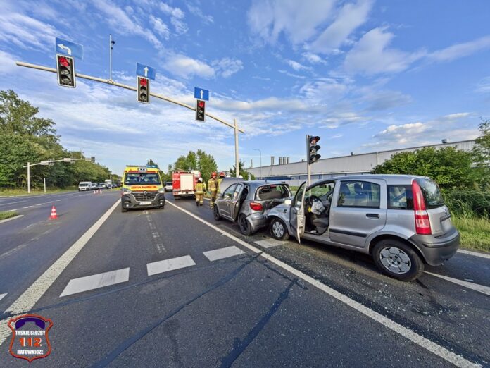 27 lipca po godzinie 18:10 dyżurny SK KM PSP Tychy otrzymał zgłoszenie o zderzeniu dwóch pojazdów na ul. Turyńskiej (DK 44) w rejonie skrzyżowania z ul. Samochodową. Ze zgłoszenia wynikało, że doszło do najechania na tył poprzedzającego pojazdu. W zdarzeniu brały udział Toyota Yaris i Fiat Panda. Na miejsce zdarzenia zadysponowane zostały: 3 x ZRM, zastępy strażaków JRG Tychy i OSP Bieruń Stary, załoga LPR – Ratownik 4 oraz Policja. Na czas działań ruch w kierunku Bierunia został zablokowany, a celem rozładowania powstałego zatoru na skrzyżowaniu została wprowadzona ręczna regulacja ruchem. W wyniku zdarzenia poszkodowane zostały trzy osoby, w tym dziecko. Nieletni podróżujący Toyotą oraz dwie osoby podróżujące Fiatem. Nieletni (15lat) naziemnym ZRM został przetransportowany do GCZD Katowice Ligota, kierowca (82 lata) Fiata trafił naziemnym ZRM do szpitala Megrez w Tychach. Natomiast pasażerka (79lat) Fiata z ciężkimi obrażeniami ciała została przetransportowana latającą karetką do szpitala w Sosnowcu. Po blisko godzinie jeden pas w kierunku Bierunia został odblokowany. Do działań w miejscu zdarzenia został wezwany policyjny technik kryminalistyki, który wykonał pełną dokumentację ze zdarzenia. Zabezpieczone zostało również nagranie z kamer monitoringu, które pomoże w ustaleniu dokładnych przyczyn i okoliczności tego wypadku. Działania Policji na miejscu zdarzenia trwały ponad trzy godziny. Policjanci KMP Tychy prowadzą postępowanie w tej sprawie.
