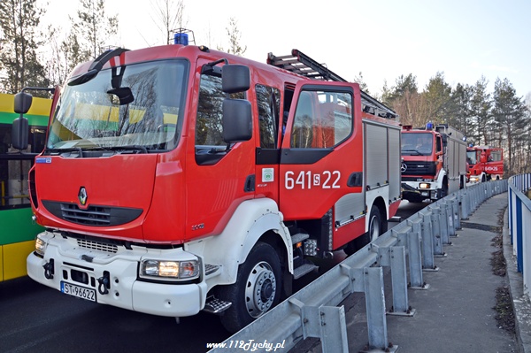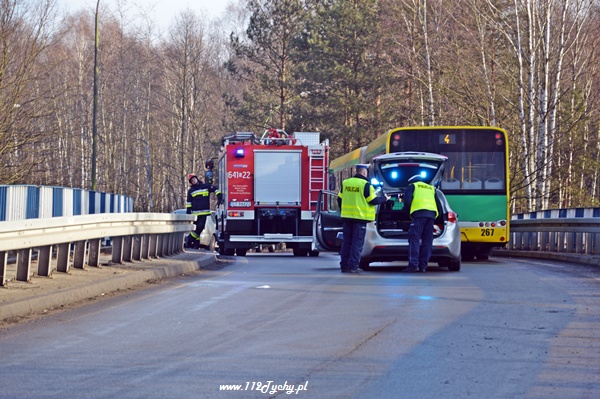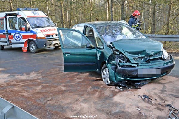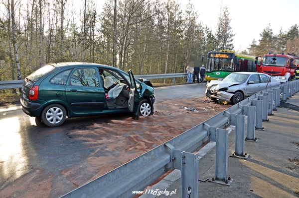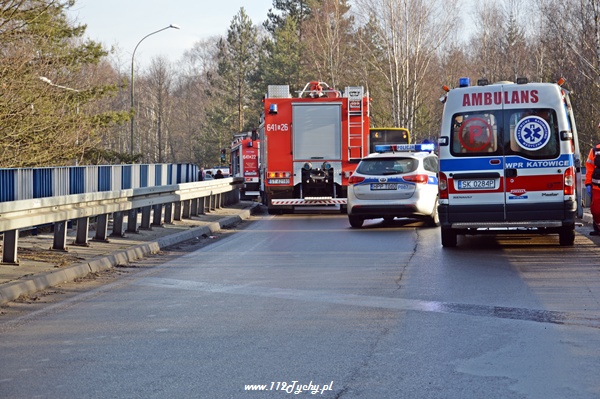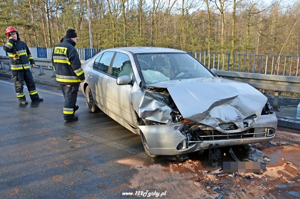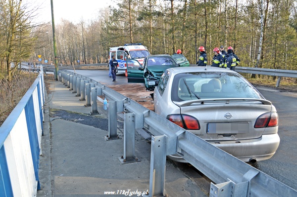 8 lutego około godziny 9.00 do MSK w Tychach wpłynęło zgłoszenie o czołowym zderzeniu dwóch samochodów osobowych na ul. Katowickiej na moście nad DK86. Na miejsce natychmiast zadysponowane zostały trzy zastępy z JRG Tychy (GBA, GCBA, SCRt), karetki pogotowia oraz patrole Policji. Po dotarciu na miejsce okazało się, że doszło do czołowego zderzenia Citroena Xsara Picasso z Nissanem Primera. W pierwszej chwili wszyscy myśleli, że jeden z pojazdów wpadł w poślizg. Jednak okazało się, że kierujący Citroenem chcąc jechać w kierunku miasta Tychy nie zastosował się do nakazanego na DK86 kierunku jazdy i postanowił sobie skrócić drogę jadąc pod prąd. Swoim zachowaniem doprowadził do zderzenia. W wyniku tego zdarzenia poszkodowane zostały dwie osoby. Działania strażaków poza zabezpieczeniem miejsca zdarzenia polegały na udzieleniu pierwszej pomocy osobom poszkodowanym, przekazaniu ich przybyłym na miejsce ZRM oraz neutralizacji wylanych płynów eksploatacyjnych. Przez cały czas trwania akcji ratowniczej ruch na ul. Katowickiej w miejscu zdarzenia był wstrzymany. Kierujący jadący w stronę Katowic byli kierowani objazdem przez skrzyżowanie przy tyskim Browarze. Z powodu wypadku utworzył się korek sięgający ul. Narcyzów. Około godziny 10 dwa zastępy Straży Pożarnej powróciły do koszar (GCBA, SCRt). Swoje czynności wykonywali również Policjanci z WRD KMP w Tychach. Dopiero około godziny 12 ruch w tym miejscu został całkowicie udrożniony, a uszkodzone pojazdy zostały usunięte z drogi. Kierujący Citroenem został uznany przez Policjantów sprawcą tego zdarzenia i ukarany mandatem w kwocie 500zł.