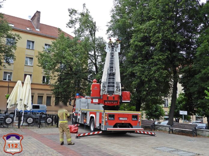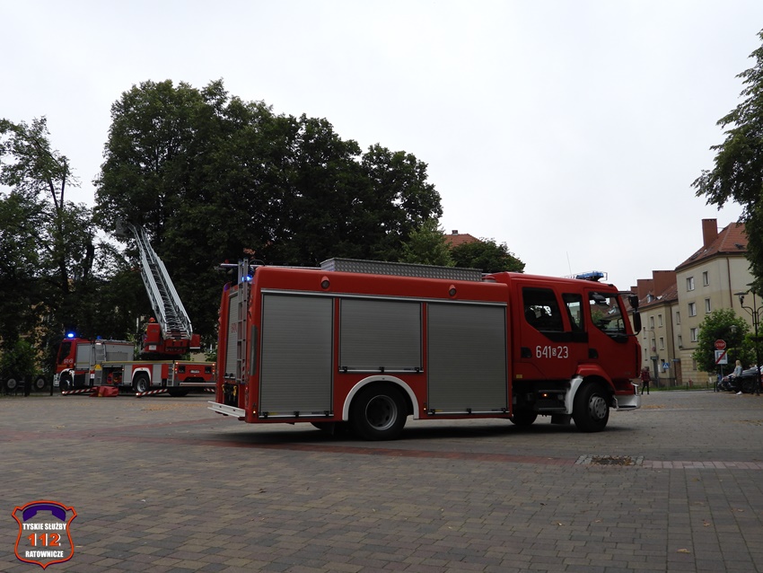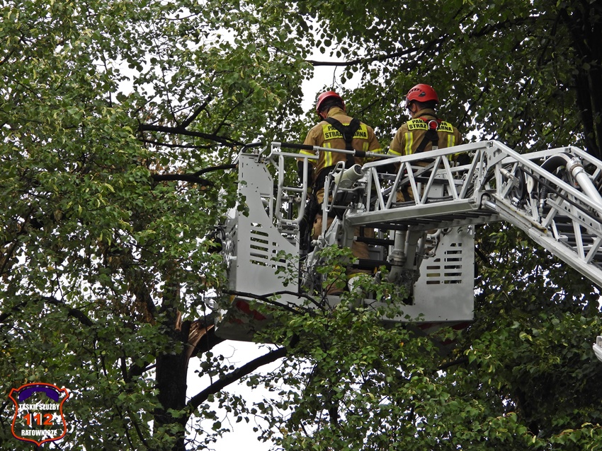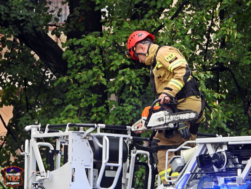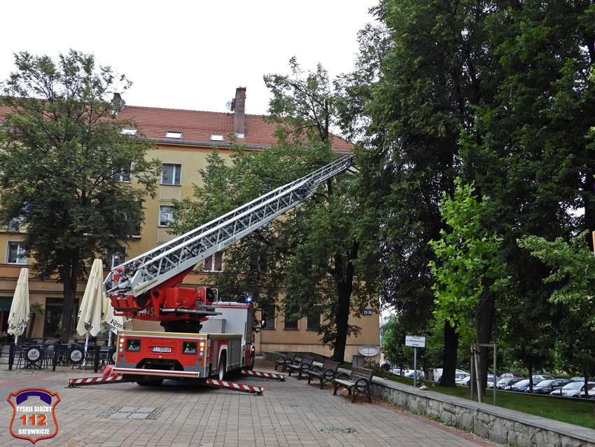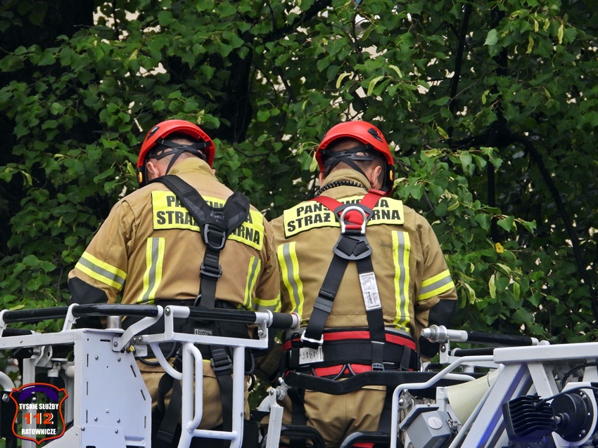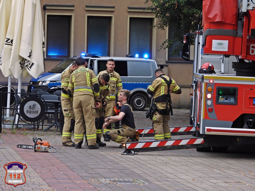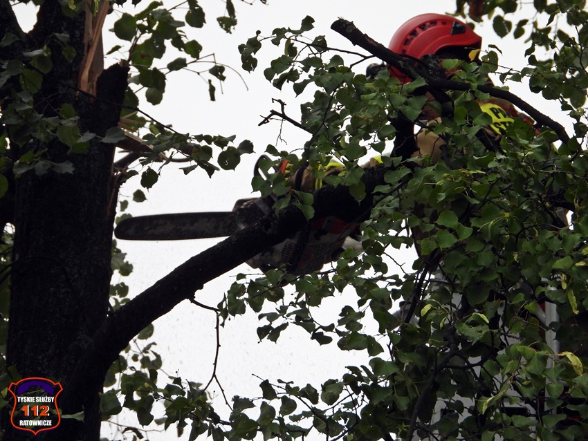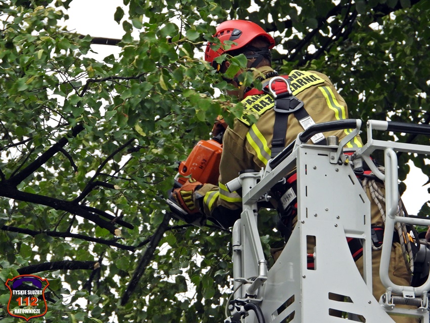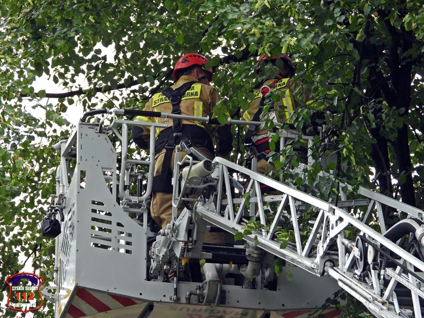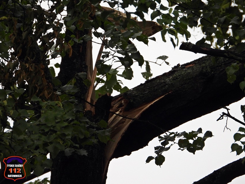 5 sierpnia około godziny 17 dyżurny KMP Tychy otrzymał zgłoszenie o niebezpiecznie wiszącym złamanym konarze na jednym z drzew na terenie Placu Baczyńskiego. Na miejsce zgłoszenia zadysponowany został jeden z podległych patroli. Po przybyciu na miejsce Policjanci potwierdzili zgłoszenie i powiadomili o zagrożeni dyżurnego SK KM PSP Tychy. Do działań strażacy wyjechali dwoma zastępami. Miejsce zgłoszenia zostało zabezpieczone, a strażacy z kosza drabiny mechanicznej przy użyciu pilarki łańcuchowej usunęli zagrożenie. Działania na miejscu trwały około godziny.