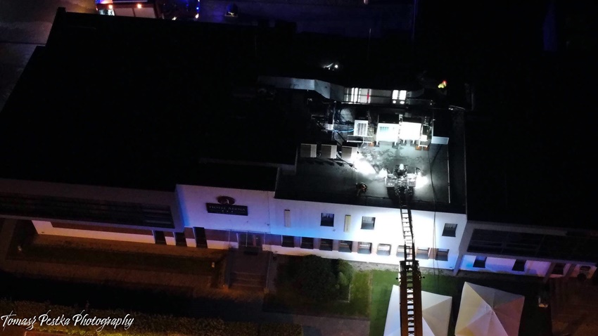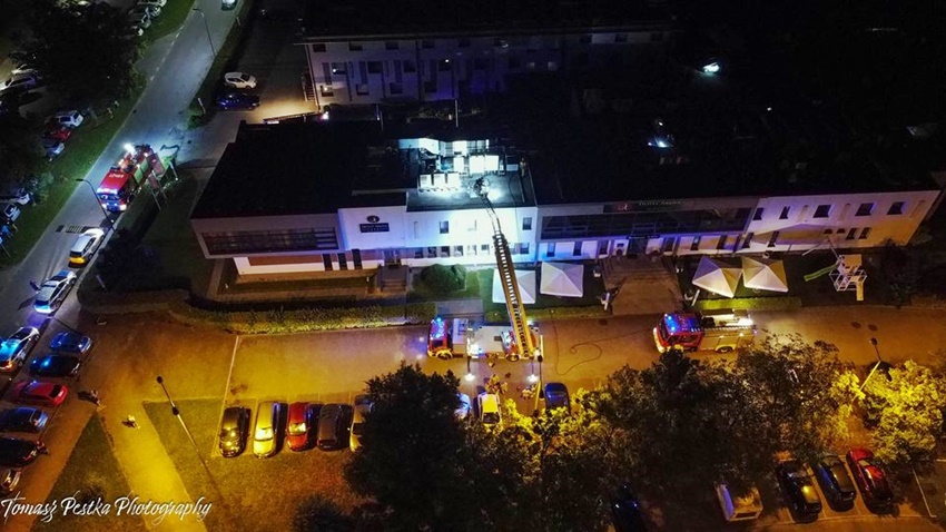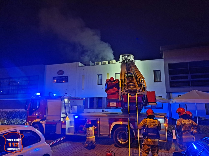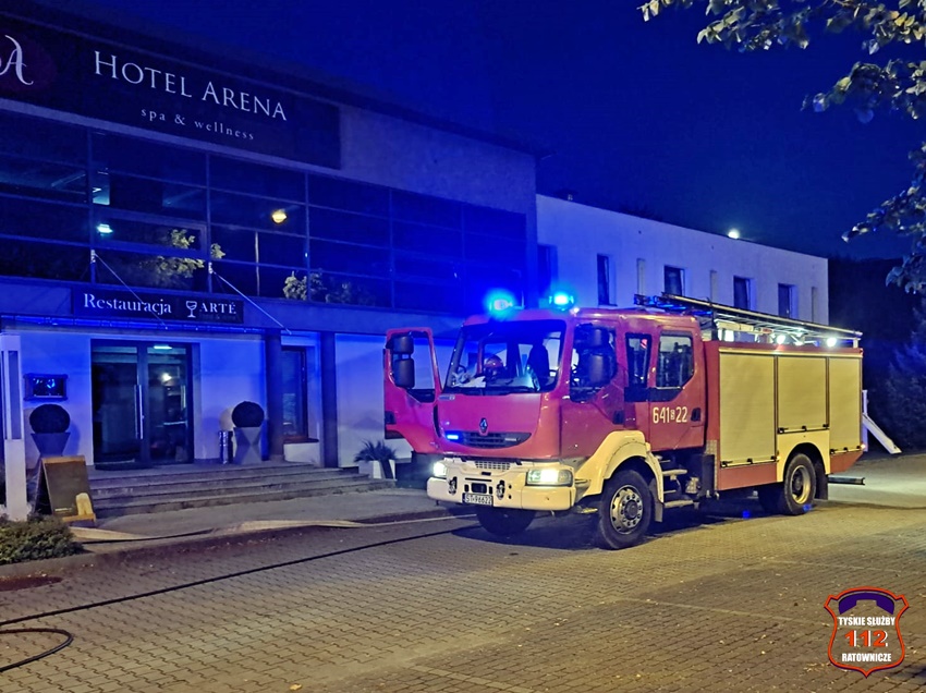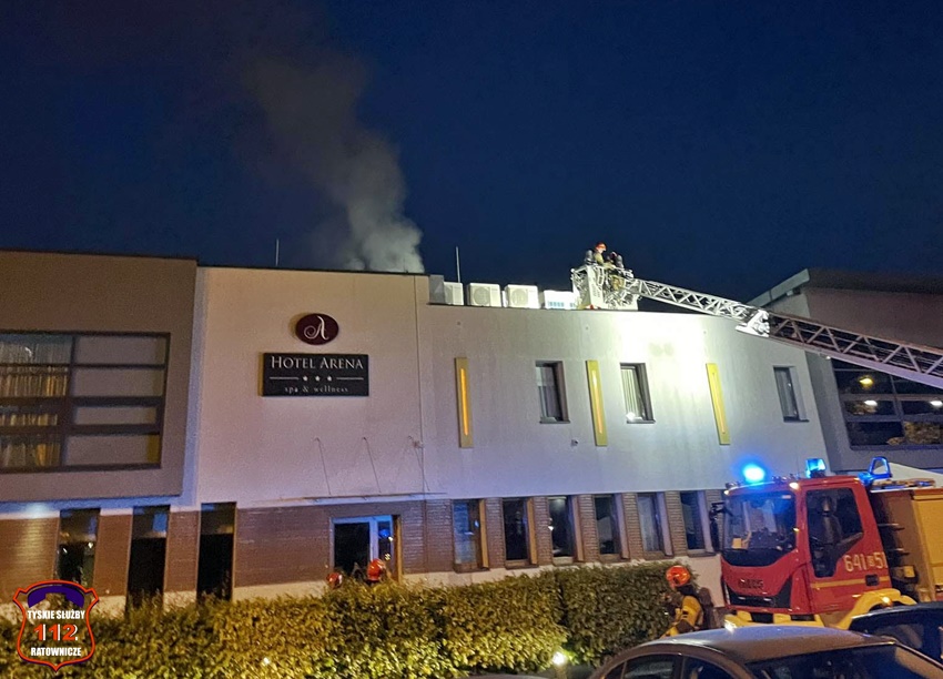 27 sierpnia o godzinie 20:17 dyżurny SK KM PSP Tychy otrzymał zgłoszenie o pożarze budynku Hotelu Arena przy ul. Ch. de Gaulle’a. Na miejsce zgłoszenia natychmiast zadysponowany został pluton gaśniczy JRG Tychy oraz Policja. Już w trakcie dojazdu zastępów strażacy widzieli pożar na dachu budynku w rejonie urządzeń filtrowentylacyjnych. Po sprawieniu drabiny mechanicznej strażacy dostali się na dach i przystąpili do działań gaśniczych. Po kilkunastu minutach sytuacja została opanowana. Z budynku hotelu ewakuowane zostały 33 osoby (23 klientów i 10 pracowników). Działania na miejscu trwały około dwie godziny. Trwają czynności mające na celu wyjaśnienie przyczyn i okoliczności powstania pożaru.