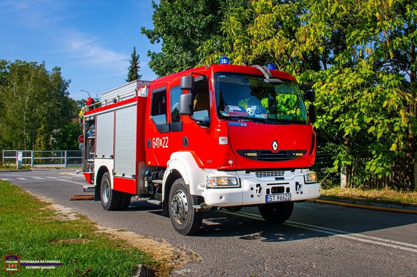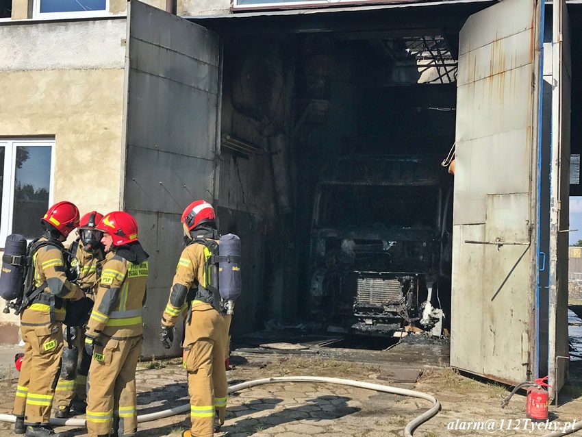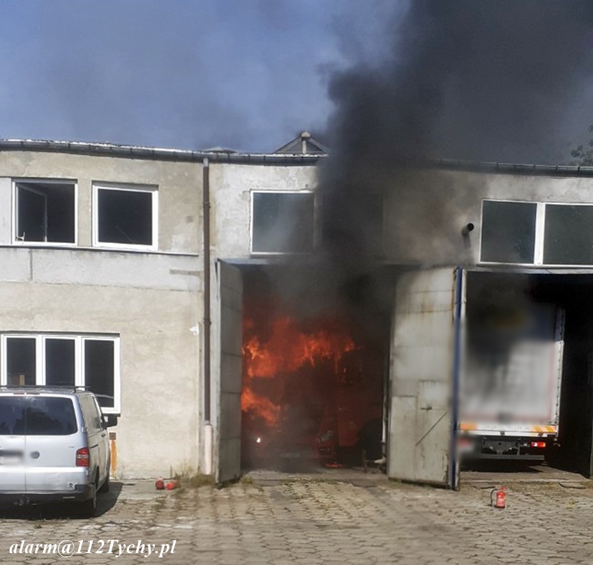 18 września około godziny 14 dyżurny SK KM PSP Tychy otrzymał zgłoszenie o pożarze samochodu ciężarowego na terenie warsztatu samochodowego przy ul. Grota – Roweckiego. Na miejsce zgłoszenia zadysponowane zostały zastępy JRG Tychy. Po przybyciu na miejsce strażacy zastali rozwinięty pożar ciągnika siodłowego z naczepą wewnątrz warsztatu. Osoby przebywające w budynku samodzielnie go opuściły. Ze względu na silne zadymienie strażacy pracowali w aparatach ochrony układu oddechowego. Wezwane na miejsce pogotowie energetyczne odłączyło zasilanie w budynku. Na źródło pożaru w pierwszej fazie podane zostały dwa prądy wody, a następnie prąd piany ciężkiej w natarciu. Zaopatrzenie wodne zostało zbudowane z pobliskiej sieci hydrantowej. Z warsztatu objętego pożarem zostały wyprowadzone dwa pojazdy. Po około piętnastu minutach sytuacja została opanowana. Spaleniu uległ ciągnik siodłowy z naczepą oraz częściowo wyposażenie warsztatu. Po ugaszeniu pożaru budynek został przewietrzony, a następnie wykonana została jego kontrola przy użyciu kamery termowizyjnej. Kolejnym etapem było wykonanie pomiarów na obecność gazów niebezpiecznych. Działania strażaków na miejscu trwały około półtorej godziny. Trwa ustalanie przyczyn i okoliczności powstania pożaru. Na czas działań gaśniczych zabezpieczenie rejonu operacyjnego KM PSP Tychy pełnił zastęp OSP Lędziny.